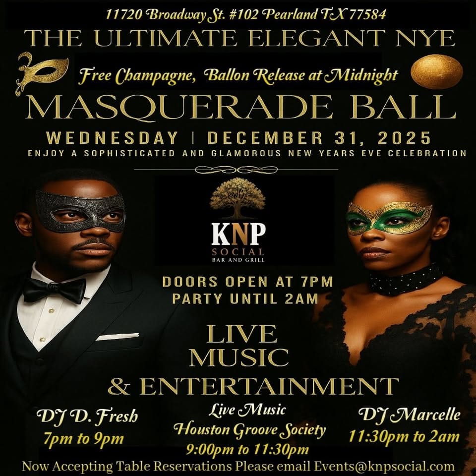 KNP Social welcomes the New Year with its elegant Masquerade Ball, featuring live music, DJs, a champagne toast, and a dressed-up celebration designed for an unforgettable night. | 7PM-2AM | 11720 Broadway Street |