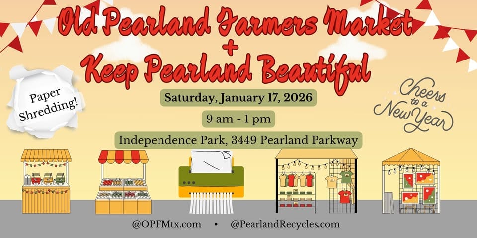 🌱 Old Pearland Farmers Market in partnership with Keep Pearland Beautiful has their first market of 2026 featuring local farms and vendors, live music, food trucks, family activities, free seed exchange with Biggs Farm, and affordable paper shredding. KPB members receive free shredding; non-members $5 up to 20 lbs. Free entry, free parking, and pet-friendly. | 9AM-1PM | 3537 Pearland Parkway